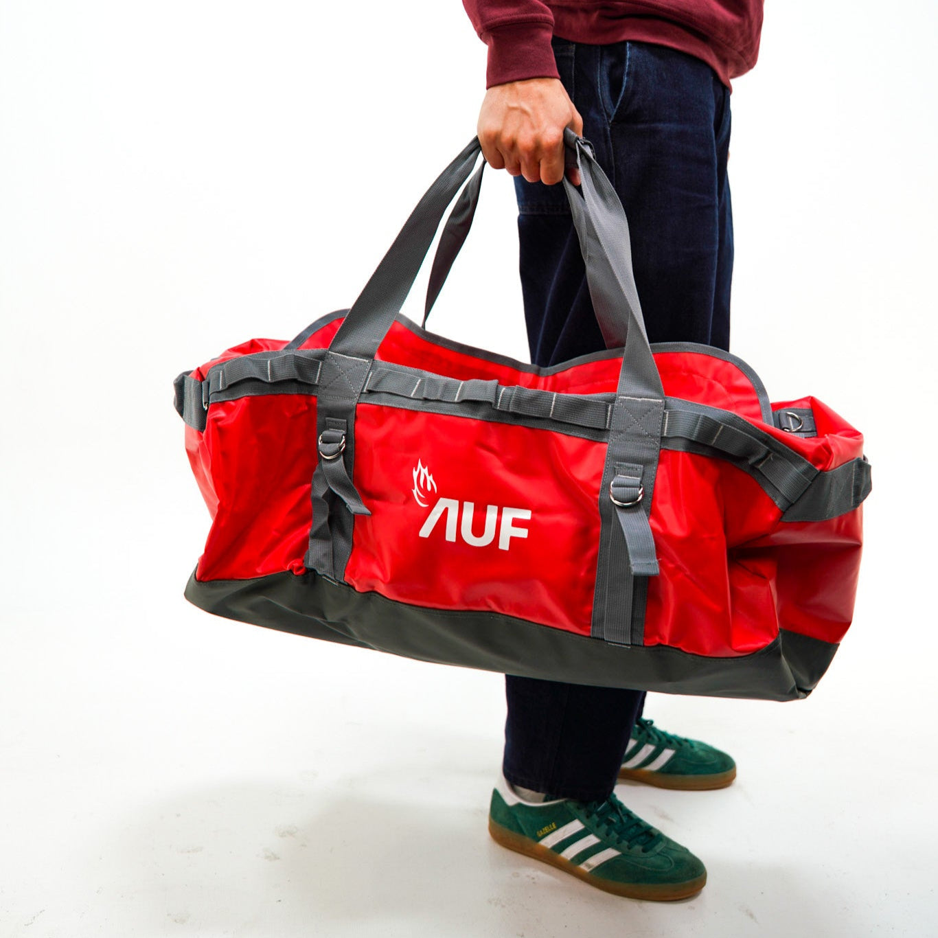 Dufflebag i AUF-rød. Perfekt for sommerleir eller årsmøte-helg.