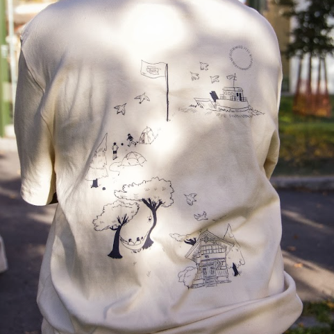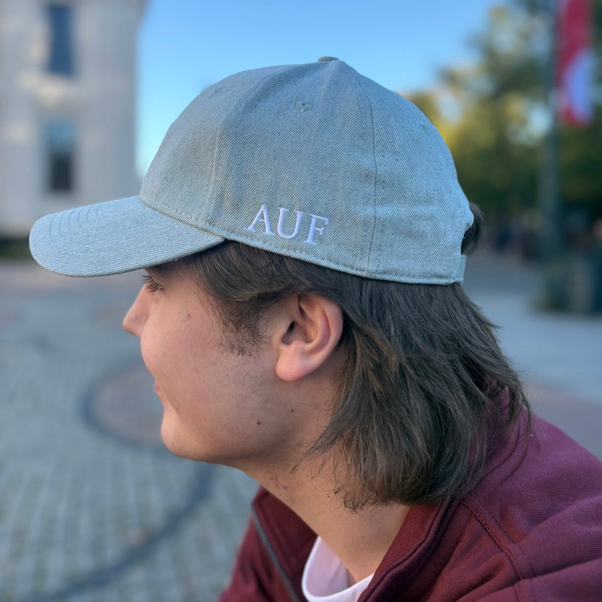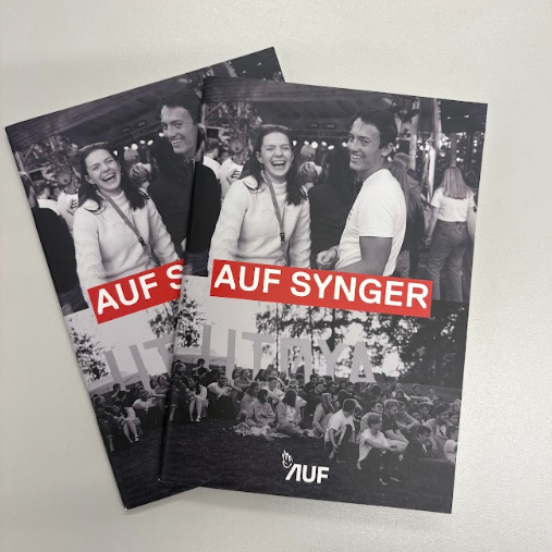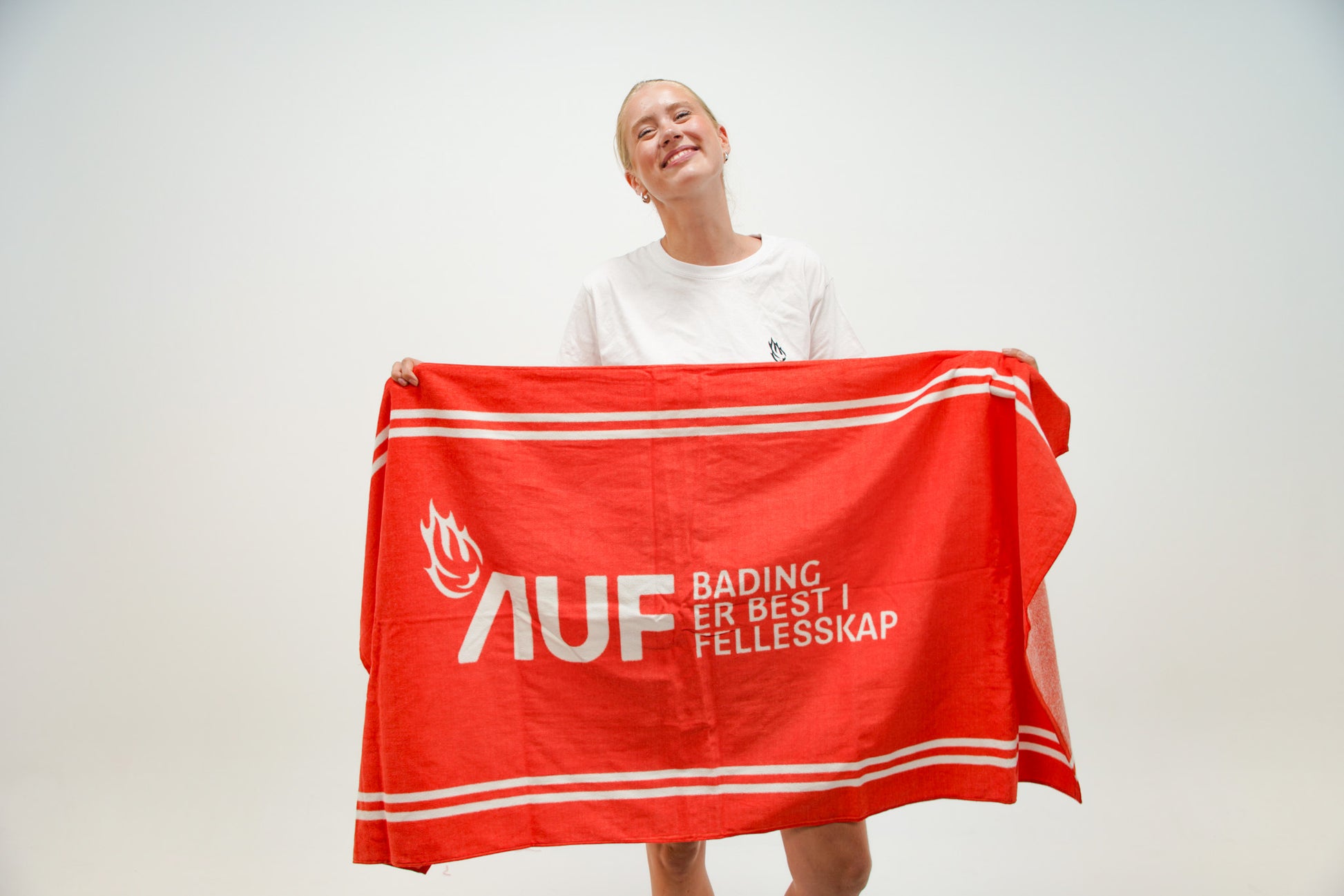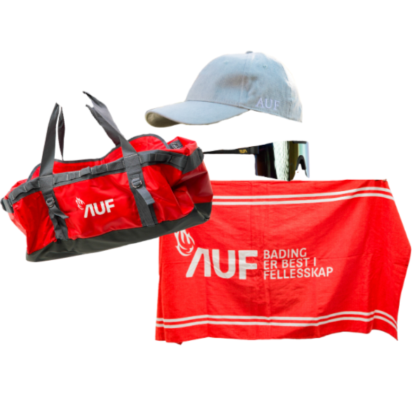 Starterpacken inneholder: stor AUF bag, Utøya t-skjorte, håndkle, raske briller, AUF caps i lys denim og AUF synger.