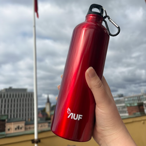 Rød aluminiumsflaske med karabinkrok og AUF-logo.